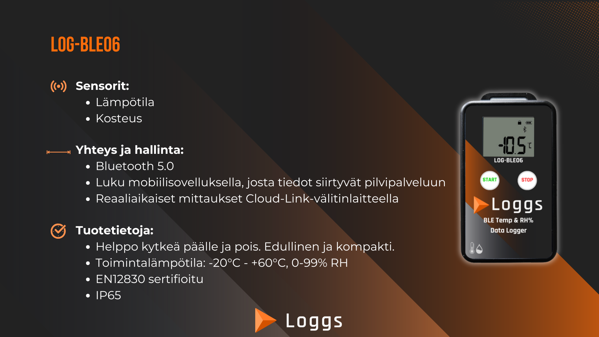 Paketti sisältää yhden Log-BLE06 -mittalaitteen ja Loggs Cloud -pilvipalvelun käyttöoikeuden 12kk ajaksi, jonka jälkeen sopimusta on mahdollista jatkaa toistaiseksi voimassa olevana. Log-BLE06 soveltuu erinomaisesti tiloihin, joissa on vähän eristystä ja lyhyt mittausetäisyys (keskimäärin 10m eristettynä) lukulaitteeseen.