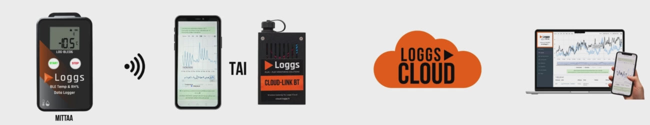 - Luetaan Loggs App -mobiilisovelluksella manuaalisesti, tai automaattisesti, josta tiedot siirtyvät Loggs Cloud-pilvipalveluun.